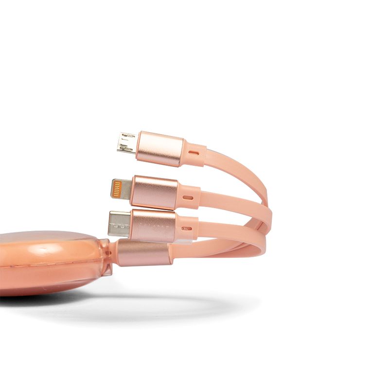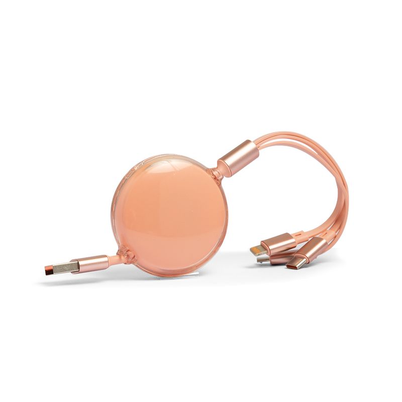 Práctico y versátil cable con múltiples entradas para diferentes dispositivos. Ideal para cargar y transferir datos en celulares, tablets y otros gadgets, todo con un diseño rosado moderno y lleno de estilo.