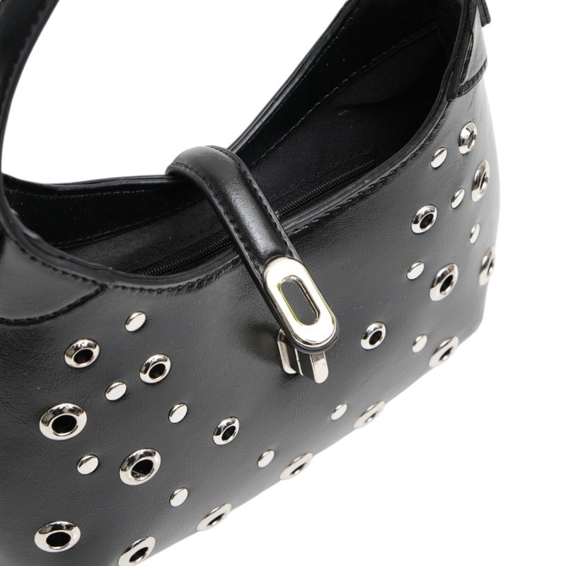 La Cartera Funky Fish Negro presenta un diseño compacto con asa corta para llevar al hombro. Destaca por sus ojales metálicos distribuidos en el frente. Su tamaño permite llevar celular, billetera, llaves y pequeños accesorios, convirtiéndola en una opción práctica para el uso diario.