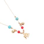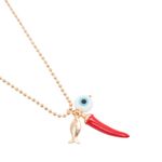 ¡Lleva la buena suerte contigo! Este collar dorado de Funky Fish cuenta con un diseño de doble cadena adornado con dijes de amuleto, incluyendo un ojo turco, elefante y detalles coloridos. Un accesorio lleno de significado y estilo para resaltar cualquier escote.