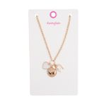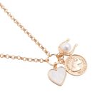 Luce un estilo lleno de encanto con este collar dorado Funky Fish. Presenta una cadena de eslabones clásicos adornada con un set de dijes colgantes: un corazón perlado, una moneda grabada con detalles románticos y una herradura con perla central. Es el accesorio perfecto para un look elegante y con carácter.