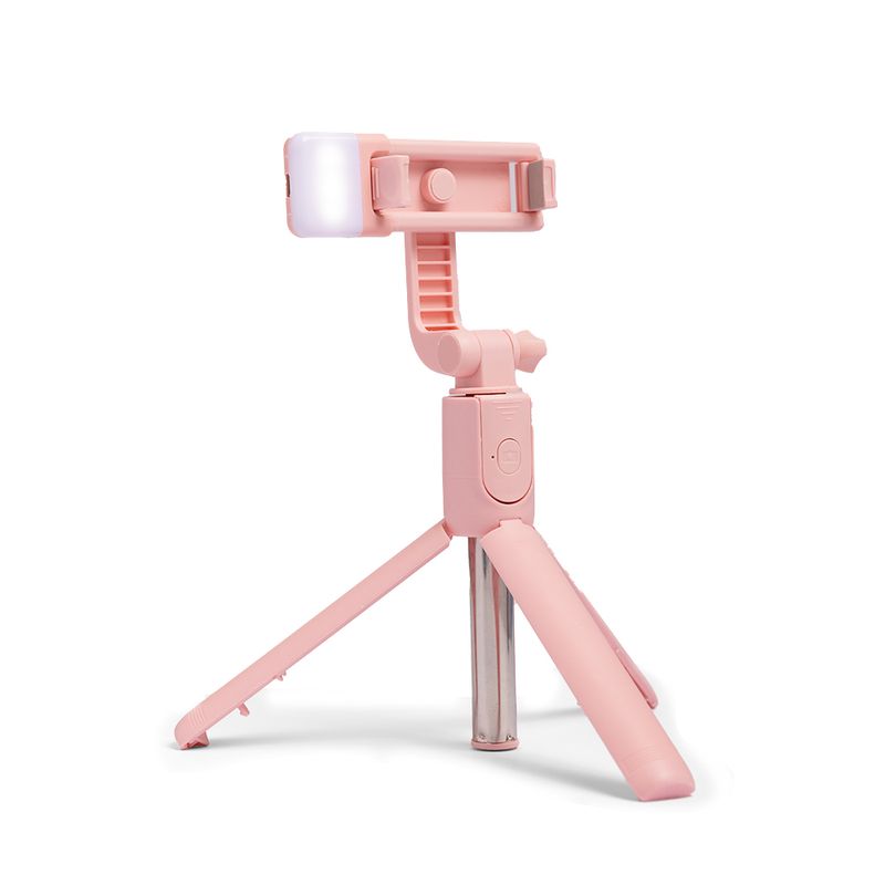 Trípode compacto con luz integrada, ideal para tomar selfies, grabar videos o hacer videollamadas con la mejor iluminación. Su diseño rosado es práctico, ligero y perfecto para llevar a cualquier lugar.