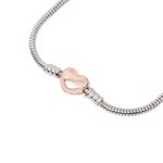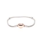 Pulsera de Cadena con Broche Corazón Oro Rosa Talla 18\n\nEsta pulsera es la combinación perfecta de tendencia y romanticismo. El baño de oro rosa con acabado de rodio le da un color cálido único y un brillo duradero.\n\n- Diseño de cadena de eslabones con cierre de corazón tipo broche.\n- Material base: Bronce, de alta calidad y resistente.\n- Baño: Oro Rosa - 10 Mills y Rodio, para un brillo intenso y cálido.\n- Talla: 18 cm (Talla 18), un tamaño más grande para un ajuste cómodo.\n\nCasos de Uso: Ideal para quienes aman el tono oro rosa y las piezas con significado.\n\nInformación Técnica:\n- Materia Prima: Bronce.\n- Tipo de Baño: Oro Rosa - 10 Mills y Rodio.\n- Medida: Talla 18 (18 cm).\n\nLa pulsera más romántica y de moda en tu muñeca. ¡Compra online tu pulsera oro rosa ahora!