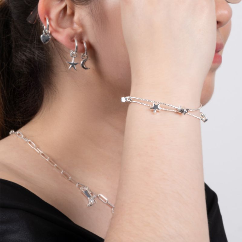 Pulsera plateada con dijes de estrellas que aportan un look delicado y mágico. Perfecta para soñar en grande.