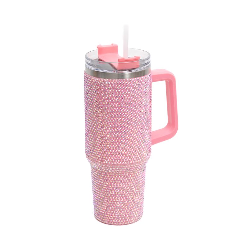 Termo Rosa con asa brillante ideal para acompañarte en cualquier actividad.